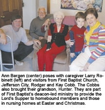 Mrs. Bergen has trouble getting around and would not be able to partake of the Lord's Supper without the ministry, which complements the service of First Baptist's Lord's Supper and homebound visitation teams.