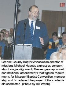 Greene County Baptist Association director of missions Michael Haynes was the only individual who spoke against the proposals. He called the changes "unbiblical," "unprecedented," "unnecessary" and "unpredictable." The proposals create suspicion, and a means to discipline churches and individuals for sin is already in place, he said.