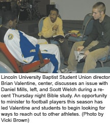 Studies in the men's cell group have focused on leadership and godliness. Valentine used the same topics with players. "I believe there are a lot of correlations between football and the life God called us to as men," he said. "I want to help them see the practical side of living Christianity."