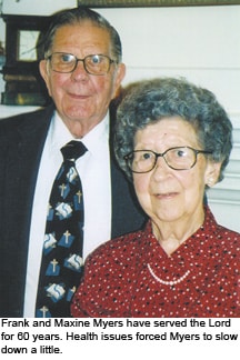 Warrensburg mayor Mary Coker proclaimed April 11, 2005, as Frank E. Myers Day in the community, noting his service as pastor of Warrensburg First Baptist Church (1962-73), as a Hospice chaplain, on the local American Red Cross board and on the Parks and Recreation Board, of which he served as president for several years.