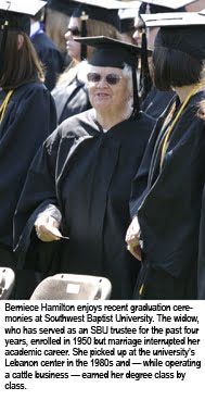 “Berniece Hamilton is a remarkable lady,” said SBU president C. Pat Taylor. “Not only does she own and operate a cow and calf operation, serve as a trustee and remain highly involved in her church and other numerous organizations, but she took the time to complete a degree, which is just amazing.”