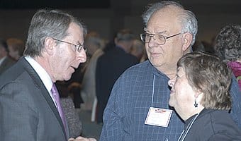 David Coffey, president of the Baptist World Alliance, talks with Harold and Crystal Wolgast of Topeka, Kan.