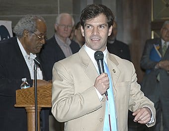 Missouri Senator Jeff Smith, a fourth district Democrat, addresses a rally on behalf of the state’s children at the Capitol. Smith sponsored legislation to provide health coverage for 10,000 children through Missouri's State Children’s Health Insurance program, but it was turned down by the House and Senate. To the left of Smith is Wallace Hartsfield Sr., pastor emeritus of Metropolitan Missionary Baptist Church in Kansas City, the event chair.