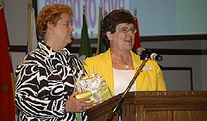 Missouri Baptist Convention Woman’s Missionary Union/Women’s Ministry Specialist Vivian McCaughan (right) presents a gift to outgoing Missouri WMU president Lorraine Powers. Powers led WMU for five years.