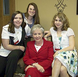 The 2009 Missouri Acteens council poses with with Wanda Lee, national Woman’s Missionary Union executive director, during a break in last weekend’s M-Counter. Council members are (from left) Hillary Wheeler, Amanda Eudy and Moriah Isringhausen.