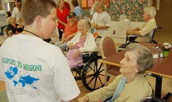 Skyler Creason of Clarksburg, left, visits with a care center resident. Students sang, performed a puppet show and visited residents at Moniteau Care Center in California and Tipton Oak Manor in Tipton as projects during Concord Baptist Association's Passport to Missions Children's Camp this summer.