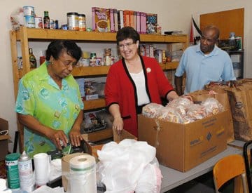 |    			North American Mission Board missionary Vivian McCaughan (center), also coordinator of Missouri's World Hunger fund, meets with Theresa and Curtis Smith at the Metro North Family Ministry Center in North St. Louis County, to help stock a food pantry that serves about 450 people monthly. Theresa is the center's director and Curtis, her retired husband, works with her. (Photo: Laura Sikes) 			 |