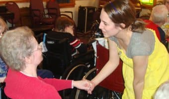 Katie Goldstein visits with a care facility resident on a recent Friday. She helped organize weekly visits to two nursing homes and an Alzheimer's care wing as a Hannibal-LaGrange College Jerusalem Project. Goldstein began the ministry as a freshman. Now the junior student is beginning to look for someone to take her place as she looks to her senior year. (Photo by Tom Hufty)