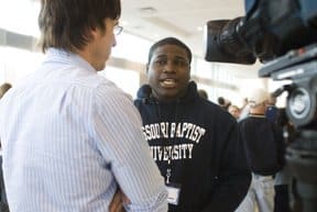 Missouri Baptist University student Montez "Pilon" Brown is interviewed by KSDX-TV Channel 5 in St. Louis during a rally to protest Missouri Gov. Jay Nixon's proposal to cut state financial aid to students in private colleges and universities. (MBU photo)