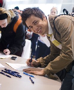 Missouri Baptist University student Thomas Childress signs a letter of protest to Missouri Gov. Jay Nixon at a March 22 rally on campus. In a March 11 speech, the governor proposed cutting state financial aid to students at private colleges to help offset a large budget deficit. (MBU photo)