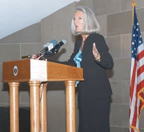 Anne Graham Lotz speaks to an overflow crowd at the Capitol Rotunda March 29 at a prayer rally to kick off 40 days of prayer and fasting for Missouri lawmakers as they face finding ways to trim $500 million from the state's budget.