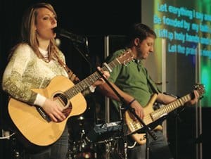 Megan Eastland and Jason Wright lead in worship at the airport-area campus of Pleasant Valley Baptist Church in Liberty.