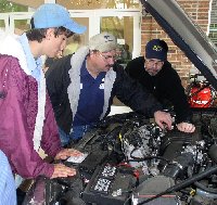 Seth Rewerts (left), Kevin Rewerts and Patrick Hamilton take a look under the hood before changing the car's oil and filter and checking its tires.