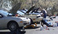 Two volunteers work their way down a line of vehicles to change oil and filters and check tires in the parking lot of Memorial Baptist Church at Memorial Baptist Church, Columbia, Mo. At the April event, about 25 volunteers services 72 vehicles for five hours.