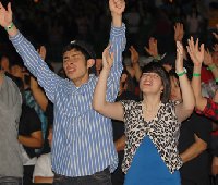 Students from Primera Iglesia Bautista in Fort Worth worship during the second general session at Congreso, an annual event for Hispanic teens and young adults sponsored by the Baptist General Convention of Texas. More than 7,000 students and leaders attended the event at Baylor University this year. (PHOTO/Kaitlin Chapman/Texas Baptist Communications)