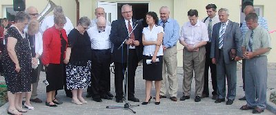 The Baptist Home President Steven Jones (center), assisted by Mila Pekun, offers a prayer during dedication ceremonies June 26 for the Baptist House of Mercy, a renovated home for up to 54 elderly Belarusian Baptists. (Jim Nelson/TBH photo)