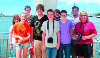 Students and sponsors from First Baptist Church, Cape Girardeau, pause at Pearl Harbor during a break at Passport Adventure camp in Honolulu. Pictured are, from left, Lydia Meece, Abby Shupert, Seth Williams, Peter Meece, Zachary Kyle, Austin Shupert, Kaleb Brown, Luke Williams, Nathan Meece and Debbie Phillips. Keith Kyle also participated. (FBC, Cape Girardeau photo)