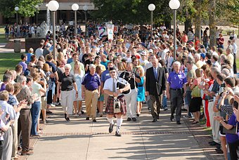 Southwest Baptist University President Pat Taylor (center, in purple) and SBU's Executive Cabinet lead new students and leaders into the chapel as faculty and staff welcome them as part of recent Welcome Week activities. (Southwest Baptist University photo)