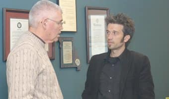 Emerson Swope (left) of Forest Park Baptist Church, Joplin, visits with Saulius Karosas during the Lithuanian's recent visit with members of the Future Leadership Foundation board. Swope will lead a Missouri team to Lithuania in March to teach financial management, utilizing Crown Financial Ministries material.