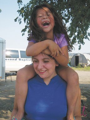 Lydia Pratt gives Alika a ride on her shoulders during a Second Baptist Church, Liberty, trip to the Cheyenne River Reservation in South Dakota. Through Together for Hope West, Second Baptist partners with the Lakota to assist with a variety of community development needs.