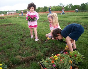 Three young children—(left to right) Dani, Mia and Arie—participate in planting a community garden. Second Baptist Church in Liberty, Mo., involves people of all ages in planting, maintaining and harvesting the garden. (PHOTO/Courtesy of Second Baptist Church, Liberty, Mo.)