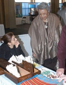 Carol Bercian (left), founder of Tabitha Ministry in Guatemala City, displays items women who live in or near the city dump make to earn a living. (Bill Webb photo)
