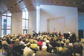 Central Baptist Theological Seminary students, faculty and staff listen to a choral presentation in the seminary's new chapel. The Baugh-Marshall Chapel dedication and open house April 8 attracted more than 300 attendees. (CBTS photo)