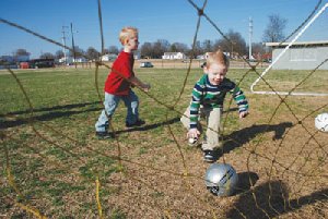 Aidan, left, and Dylan (in the green shirt) love soccer and the new church home they found with their family through participation in the soccer league offered by First Baptist Church in Kannapolis through local elementary schools.