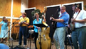 |    			Gary Furr, second from right, pickin’ and grinnin’ at First Baptist Church of Williams. 			 |