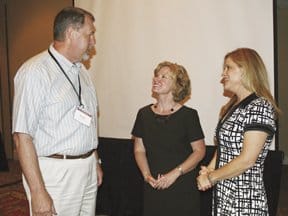 Keith Herron, pastor of Holmeswood Baptist Church in Kansas City, visits with past CBF Moderator Christy McMillin-Goodwin (center) and Moderator Colleen Burroughs of Birmingham, Ala. Herron was chosen as moderator-elect for 2011-12. (Photo by Robert Dilday)