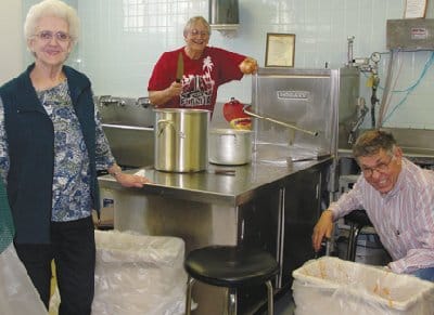 Wyman Grindstaff (center) clowns around with Janice and Ed Ksara as they prepare a meal in the kitchen at University Heights Baptist Church, Springfield. (University Heights Baptist Church photo)