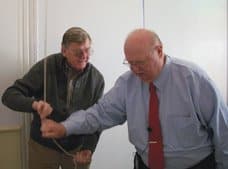 Earl Hamner Jr. (left) and Pastor Tom Fowler ring the church bell at Schuyler Baptist Church.