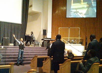 Though the satellite viewing itself drew a small crowd, about 6,000 people typically worship at Sharon in two Sunday morning services. Reed, who is the pastor’s sister, said the church moved to its current site from an inner city location in 1999. Two years later the original church burned, leaving only charred bricks and the cross which had sat atop the roof.