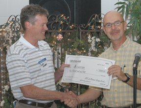 Chuck Arney (left), pastor of Cornerstone Baptist Church, Lee’s Summit, receives the 2012 Circle of Giving check for $5,000 from Charles Cantrell of the CBF of Missouri Foundation. Arney said the check will help fund a walk-in freezer for Coldwater Ministries. (Bill Webb photo)