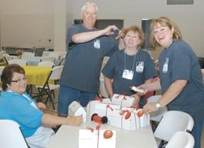From left, Laverne Smith, Mike Shupert, Becky Gentry and Debbie Kyle pause while preparing CARE packages for Southeast Missouri State University students during finals week. All are from Springfield. Shupert is pastor of First Baptist Church, Cape Girardeau.