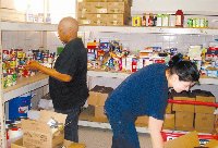 Mira Zivonav, right, and a volunteer organize groceries to be given away on Saturday mornings. (Photo by Kirkwood Baptist Church)