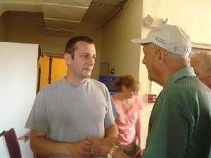 Sasa Zivonaz (left), a Cooperative Baptist Fellowship self-funded missionary, visits with volunteer Wil Duke of Kirkwood Baptist Church. (Photo by Kirkwood Baptist Church)