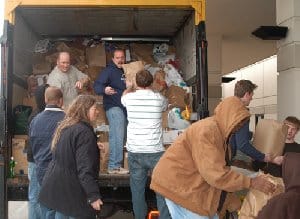 Volunteers load the truck for In As Much Ministry after a weekend food drive at Pleasant Valley Baptist Church, Liberty.