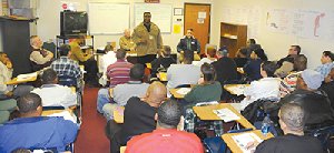 Paul Owens, education coordinator for Welcome Back/Tarrant County, a faith-based re-entry program for ex-offenders, talks to a group of recently released prisoners.