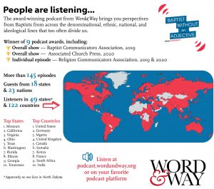In 2018, Word&Way launched the award-winning podcast “Baptist Without An Adjective,” a weekly show that features interviews with Baptists across the denominational, ethnic, national, and ideological lines that too often divide us. Listeners tune in from across the country and around the world.
