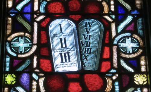 The Ten Commandments in stained glass at Saint Patrick Catholic Church in Junction City, Ohio. (cropped image courtesy of Nheyob)