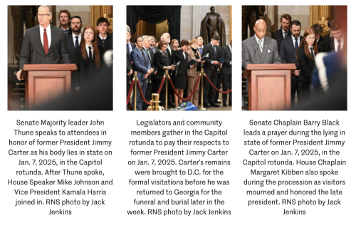 WASHINGTON (RNS) — Scores of lawmakers and other dignitaries huddled together in the U.S. Capitol rotunda on Tuesday evening (Jan. 7) for a memorial service honoring Jimmy Carter, heaping praise on the late Democratic president before he lies in state over the next day.