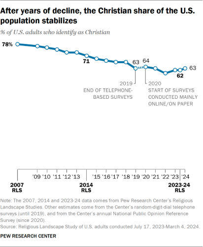 The Religious Landscape Study finds 62% of U.S. adults call themselves Christians. While a significant dip from 2007, when 78% of Americans identified as Christian, Pew found the Christian share of the population has remained relatively stable since 2019.