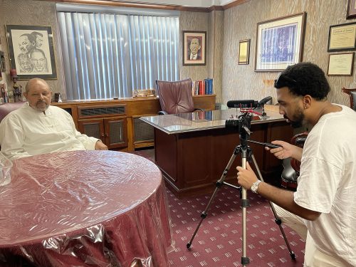 Filmmaker Jahleel Hills, right, prepares to interview the Rev. Arlee Arkofa at Berean Baptist Church, Sunday, Aug. 10, 2025, in Brooklyn, New York. (RNS photo/Fiona Murphy)