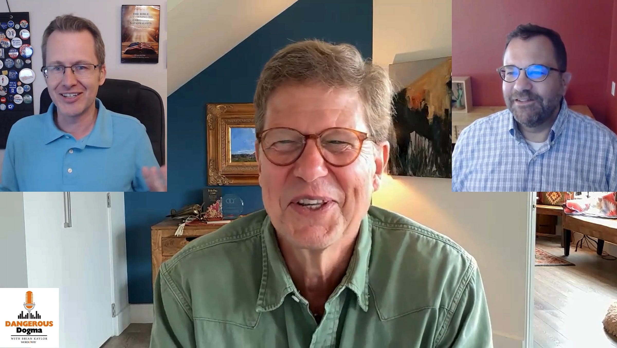Screengrab as Brian Kaylor (left) and Jared Burkholder (right) talk with Randall Balmer on this week’s episode of Dangerous Dogma.