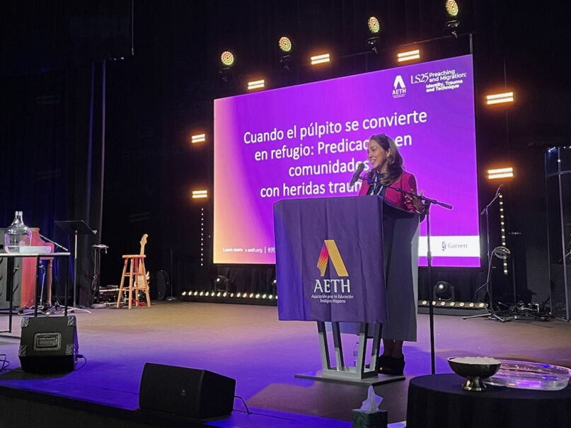 The Rev. Alexia Salvatierra speaks to the Asociación para la Educación Teológica Hispana, Oct. 10, 2025, at Life Pacific University in San Dimas, Calif. (RNS photo/Aleja Hertzler-McCain)