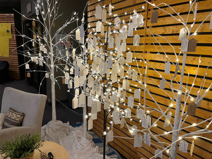 Tags with personal losses are hung from trees in a grief station at La Fuente Ministries, Oct. 8, 2025, in Pasadena, Calif. (RNS photo/Aleja Hertzler-McCain)