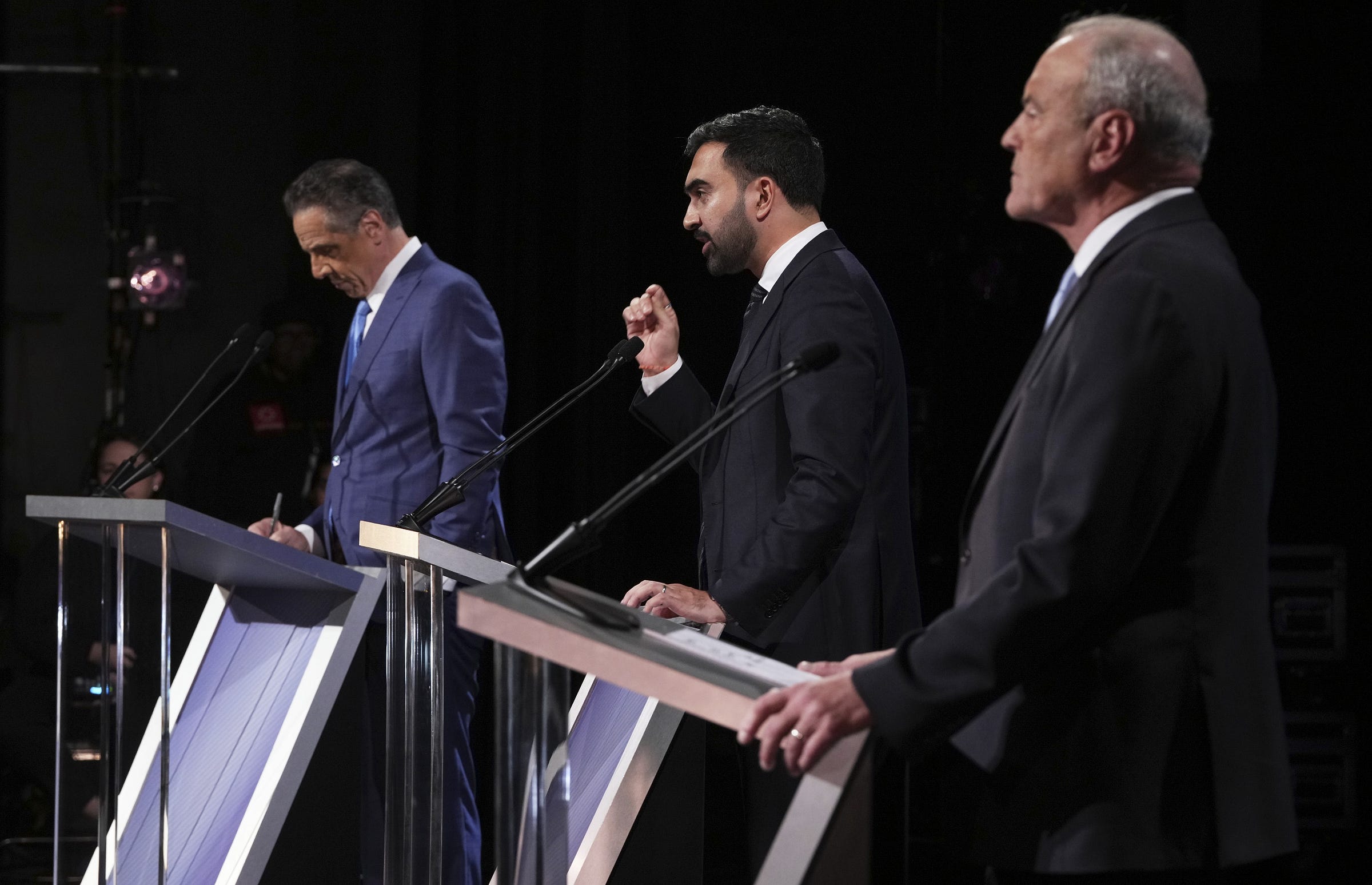 Zohran Mamdani (center) speaks during an Oct. 22, 2025, debate with Andrew Cuomo (left) and Curtis Sliwa (right) in New York City. (Hiroko Masuike/The New York Times via AP, Pool).