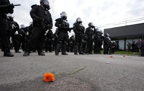 Flowers tossed by protesters lie in front of law enforcement officers outside the Broadview ICE facility on Nov. 1, 2025. (Alex Brandon/Associated Press)