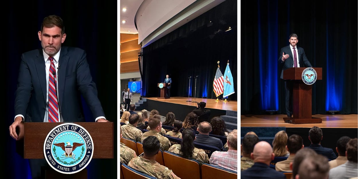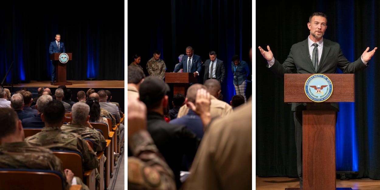 Department of War photos of Pentagon prayer services as (from left) Pete Hegseth speaks on Aug. 13, Jack Brewer prays on Sept. 18, and Garrett Kell preaches on Nov. 19.
